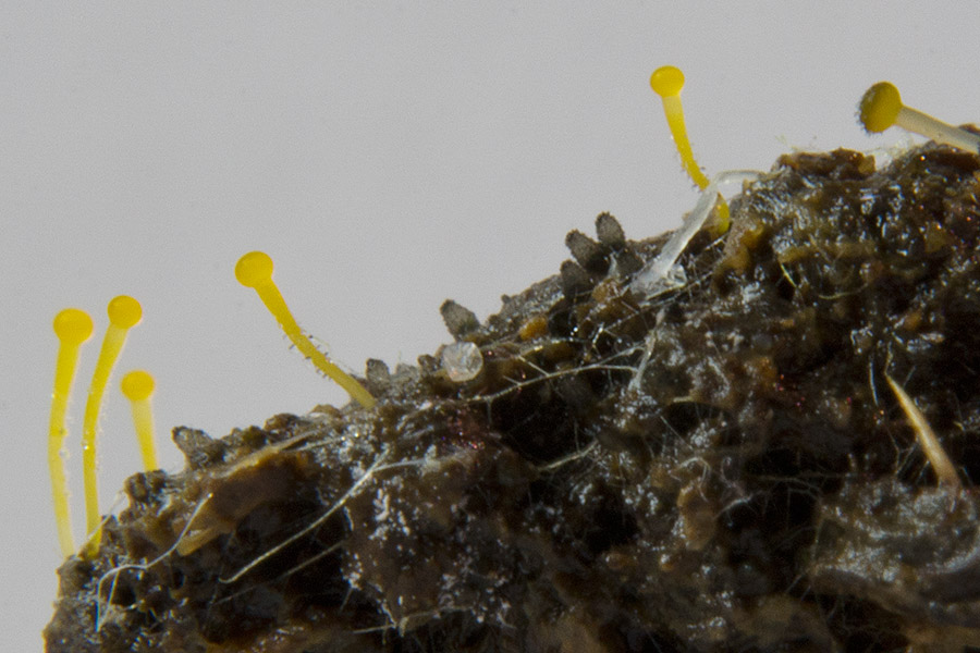 Die gelben Stecknadeln gehören wohl noch zum Pilobolus - bei den stacheligen eiförmigen Gebilden in der Mitte