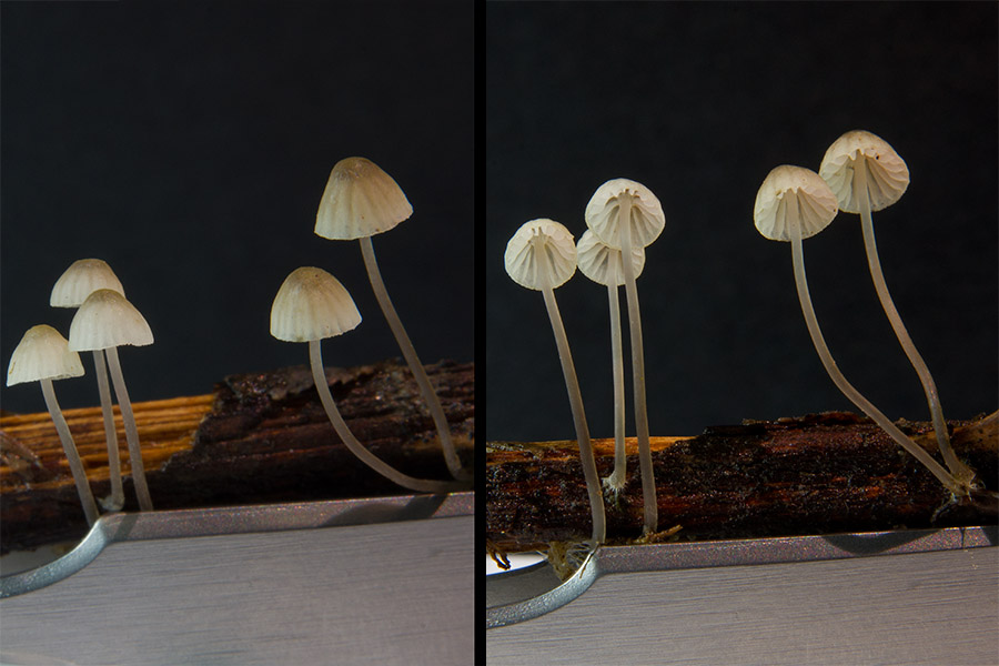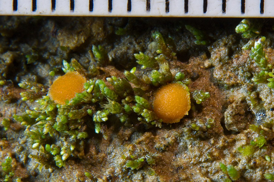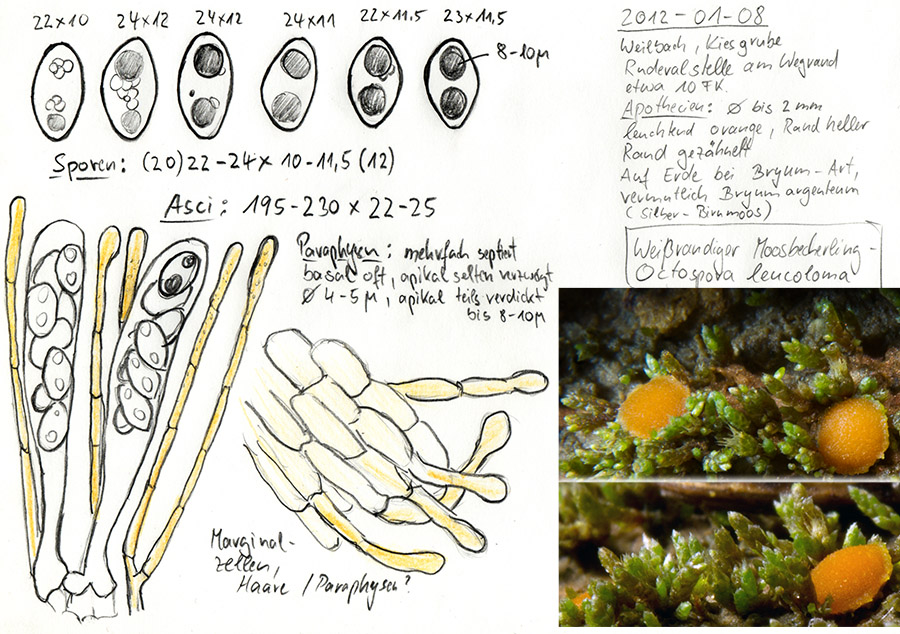 Keine Ahnung, bin auch gestern nicht sehr weit mit gekommen. Hut 5 mm, Stiel etwa 20 mm lang, auf einem dornigen kleinen Zweig. Blasige/keulige Cheilozystiden mit warzigen bis teils geweihförmigen Auswüchsen, falls das zum Bild sachdienlich ist. Und zum Schluss noch, weil sie ja gerade in Mode sind, eine Octospora.