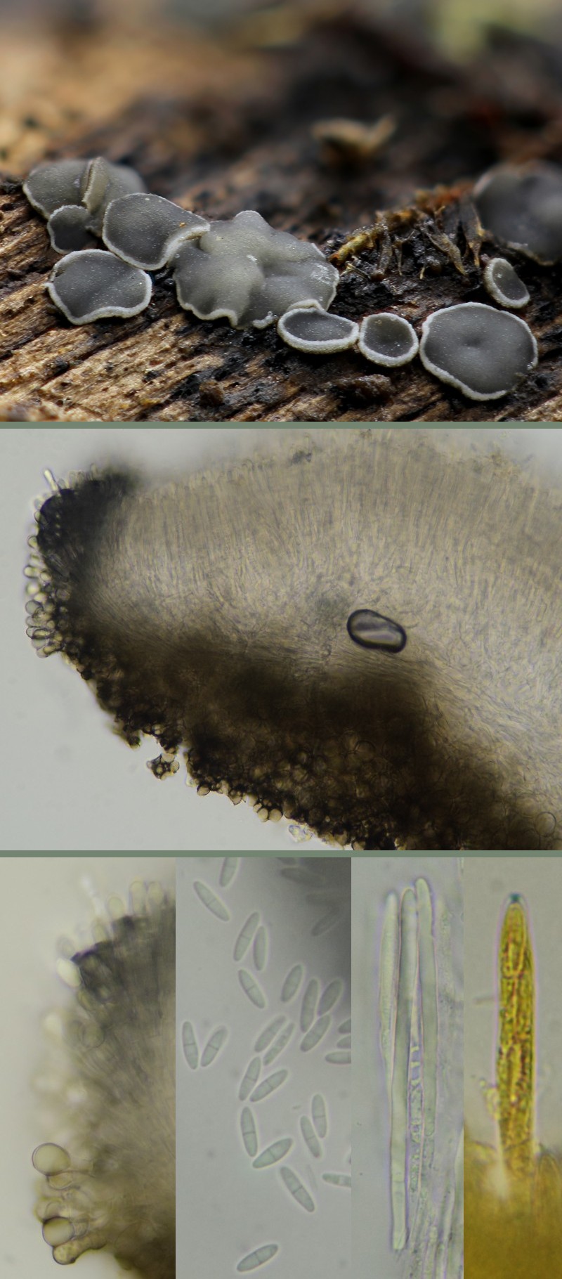 Hallo! Am Mittwoch habe ich an der Unterseite und in den Spalten eines schenkeldicken, bröckelmorschen, liegenden Holzstück von vermutlich Erle, drei (mindestens) Arten von hübschen Becherchen gefunden. Mit dem Weichbecherchen habe ich jetzt Bestimmungsprobleme. Und zwar deutet der Schlüssel von Andreas Gminder auf Mollisia atlantica hin. Die sollten aber laut Andreas in einem Beitrag auf Ascofrance nicht in Deutschland wachsen sondern nur am Atlantik.