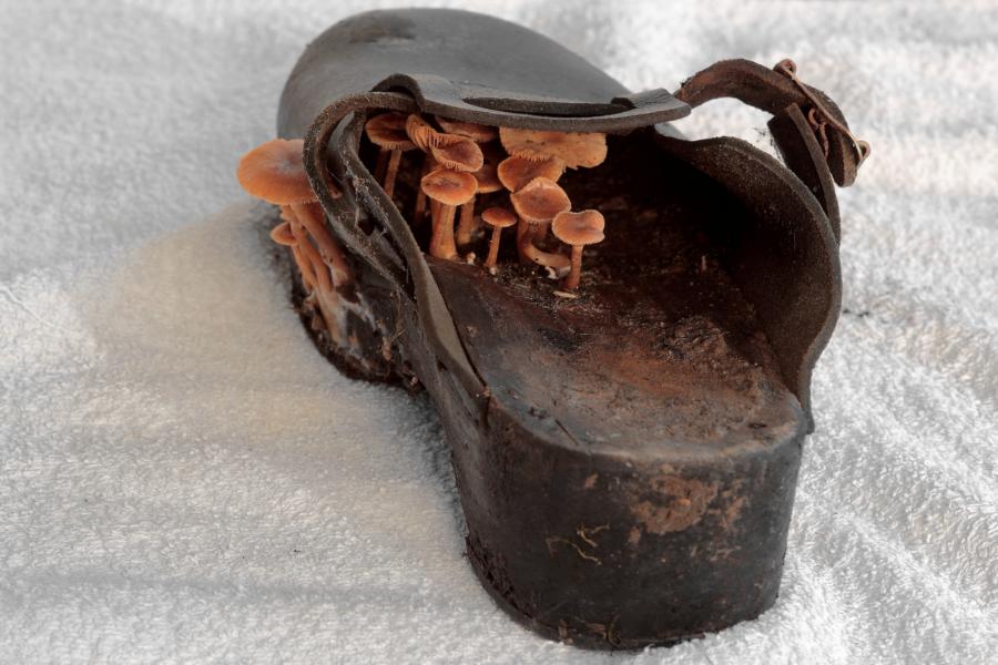 vor 1 1/2 Jahren verlor ich meinen linken Clog in meinem Gartenumland aus den Augen. Er war über viele Jahre sehr anfüßig, wußte von meiner Pilzverrücktheit und wollte mich auf sich aufmerksam machen. Er besorgte sich offensichtlich ein Myzelium und wartete, bis die Fruchtkörper das Licht suchten - und so fand ich ihn wieder!