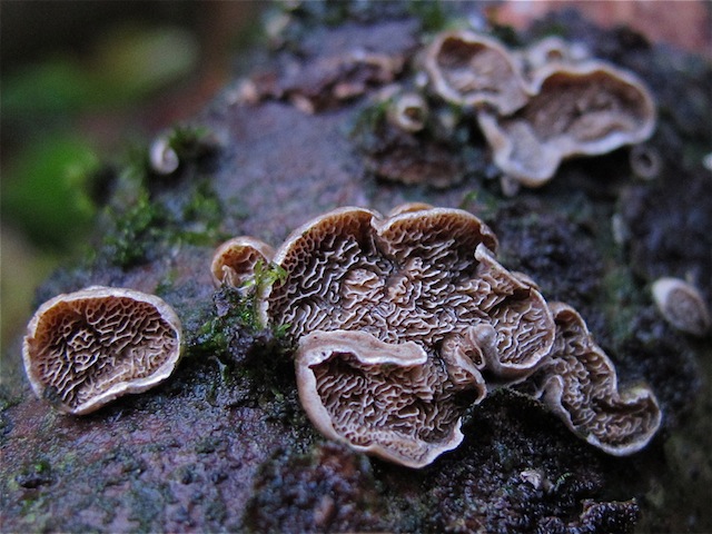 Beim Trocknen des Astes kamen viele alte kleine Porlinge (Trichaptum ?) zum Vorschein. Die Fruchtkörper wachsen entweder parasitisch auf diesen, oder die dunklen sind alte Fruchtkörper derselben Art. Ich habe keine Basidien mit Sterigmen gefunden und demzufolge auch keine Sporen.