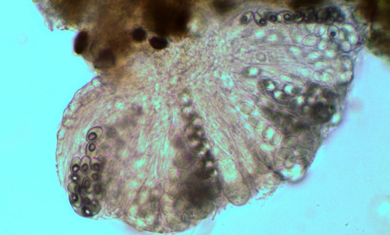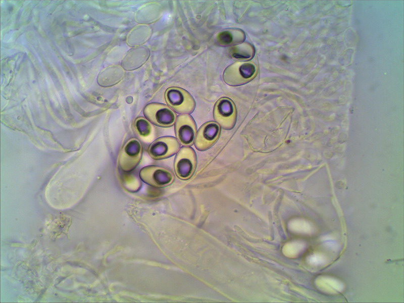 Und Nr. 3 noch kleiner, kaum zu entdecken. Hier scheinen mehr Sporen als 8, ich denke es sind 16 Sporen im Ascoschlauch. Sporengröße 10-10.4-10.7 x 6.6-7.0-7.3