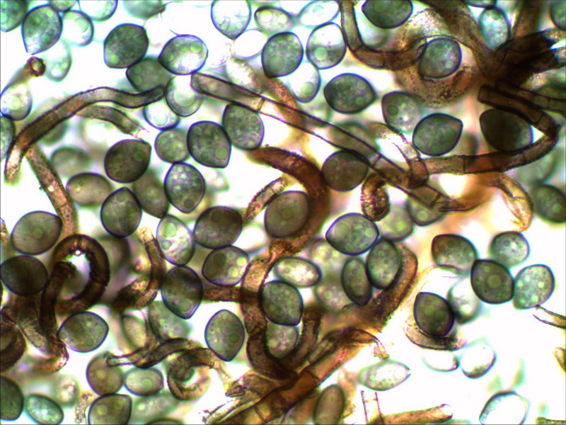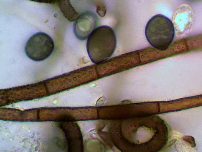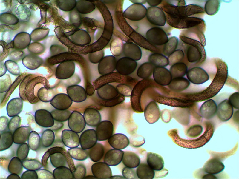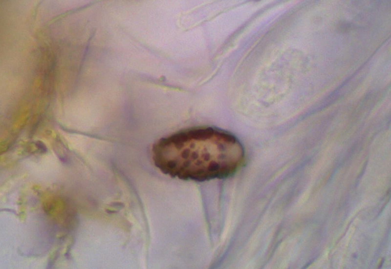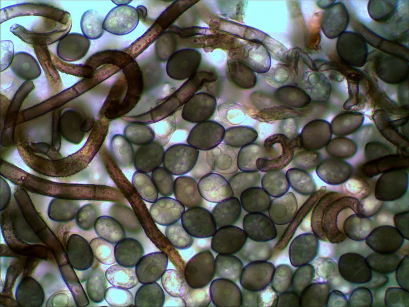heute schaute ich mal wieder auf diese Kuddeln und zupfte zuerst einen Minnipyreno ab, der hatte dunkle Locken. Leider gelang kein Makrofoto, wenn man das noch so nennen darf. Hier fand ich nur Sporen und Haare (?), leider keine Schläuche. Die Sporengröße habe ich mit 11-11.3-11.7 x 7.8-8.8-9.3 gemessen.