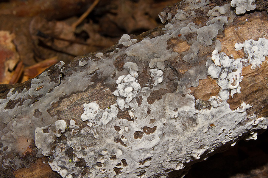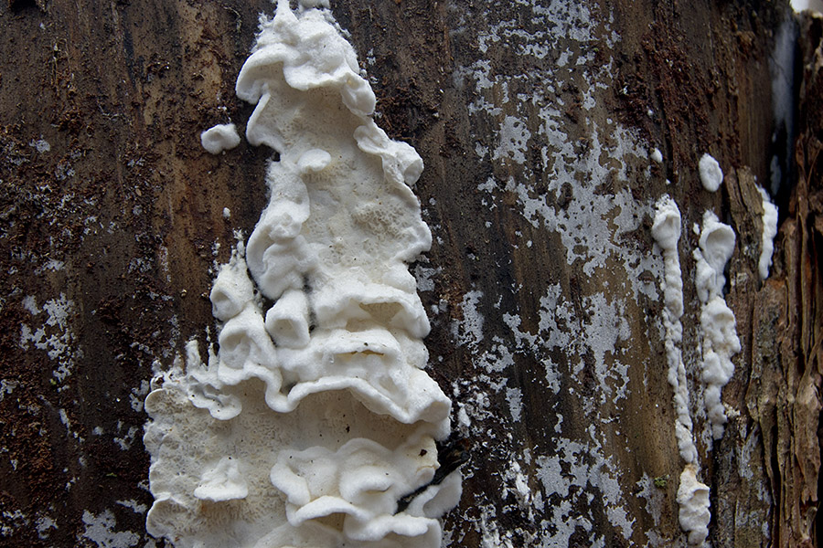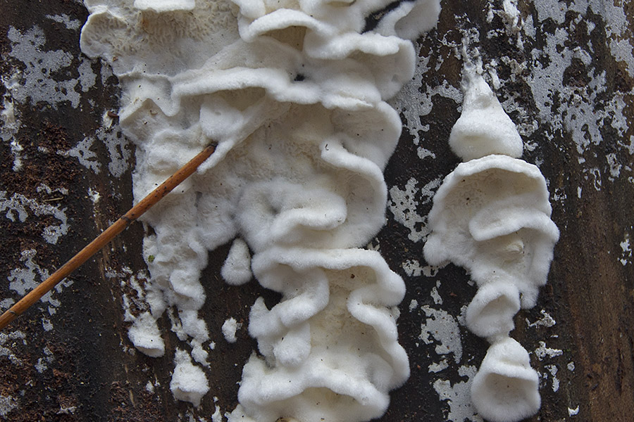 Hier auf der Rinde waren die Rhizoiden, die mir letztens auf dem unberindeten Ast völlig fehlten, schön zu sehen. Großer Zystidenkammpilz - Phlebiopsis gigantea