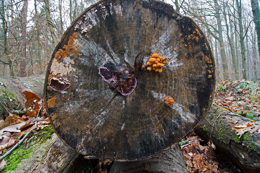 Schizophyllum commune, Chondrostereum purpureum, Flammulina velutipes, Merismodes anomolus und sicher noch einige mehr. Letzt genannte habe ich erstmalig entdeckt, wie blind war ich wohl die letzten Jahre für solche Kleinigkeiten? Gelbbrauner Haarschüsselrasen - Merismodes anomalus (anomala?)
