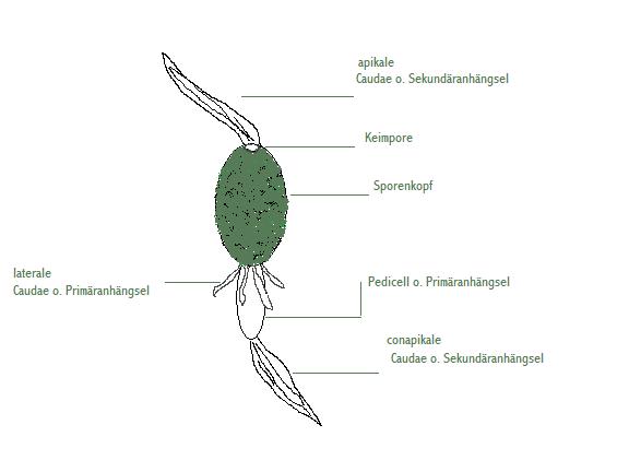 hier noch mal eine Zeichnung, wo die Bezeichnungen der möglichen Anhängsel an der Spore der Gattung Podospora oder Schizothecium erkannbar ist.