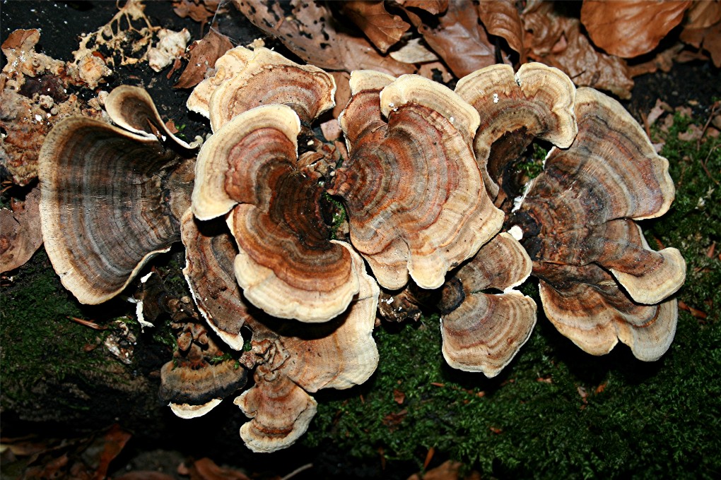 Hallo Ingo, hallo Schnuffel! Danke für Eure Antworten. Die Hüte sind oben so glänzend, weil es, wie Ingo richtig gesehen hat, 4°C hatte und der Schnee am Schmelzen war. Im derzeitigen Entwicklungsstand haben sie einen dreieckigen Querschnitt - was mich von T. versicolor abgehalten hat. Allerdings sind diese Fk wohl noch recht jung. Auch haben andere (ausgewachsene) T.v. keinen so breiten Ansatz am Substrat gehabt, sind eher muschelig-rund gewachsen, siehe Foto. Im jungen Stadium habe ich mir eine Unterscheidung zwischen T. versicolor und T. multicolor bisher (und auch jetzt) nicht zugetraut. Nun stehen für mich Eure beiden Antworten ein wenig widersprüchlich gegenüber: