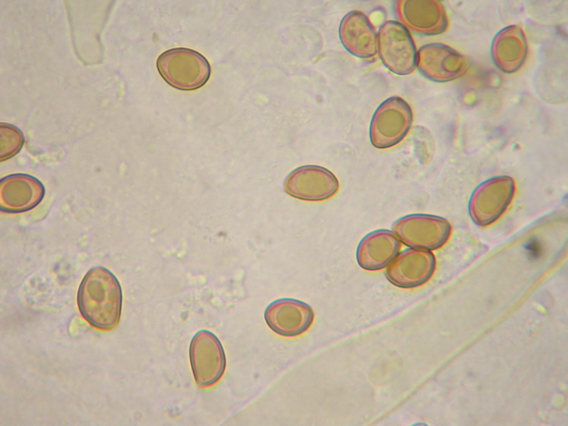 Sporen: gedrungen subamygdaloid, nur selten (vorw. bis sehr großen Sporen) mit schwacher Delle, Apex subkonisch bis abgerundet, Maße: 8,9 x 5,8 (8-10 x 5,5-6,5), Q=1,53 (1,31-1,73), 20 Sp. gemessen: