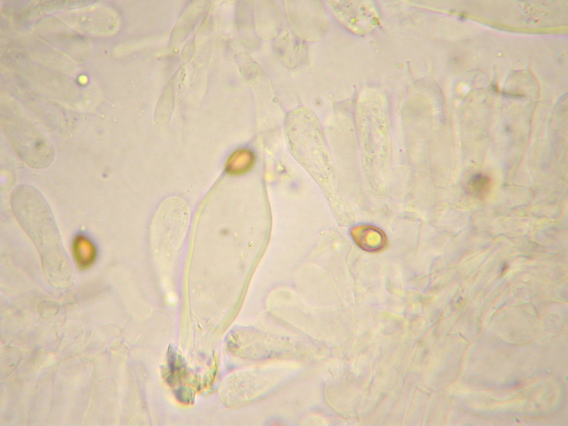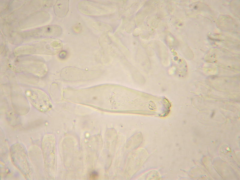 Pleurozystiden: überwiegend fusoid, auch subutriform oder keulig, stark beschopft, in KOH hyalin, ca. 48-80 x 13-19, Wandstärke am Bauch 0,5-2, am Kopf 1-2,5, ausnahmsweise bis 3;