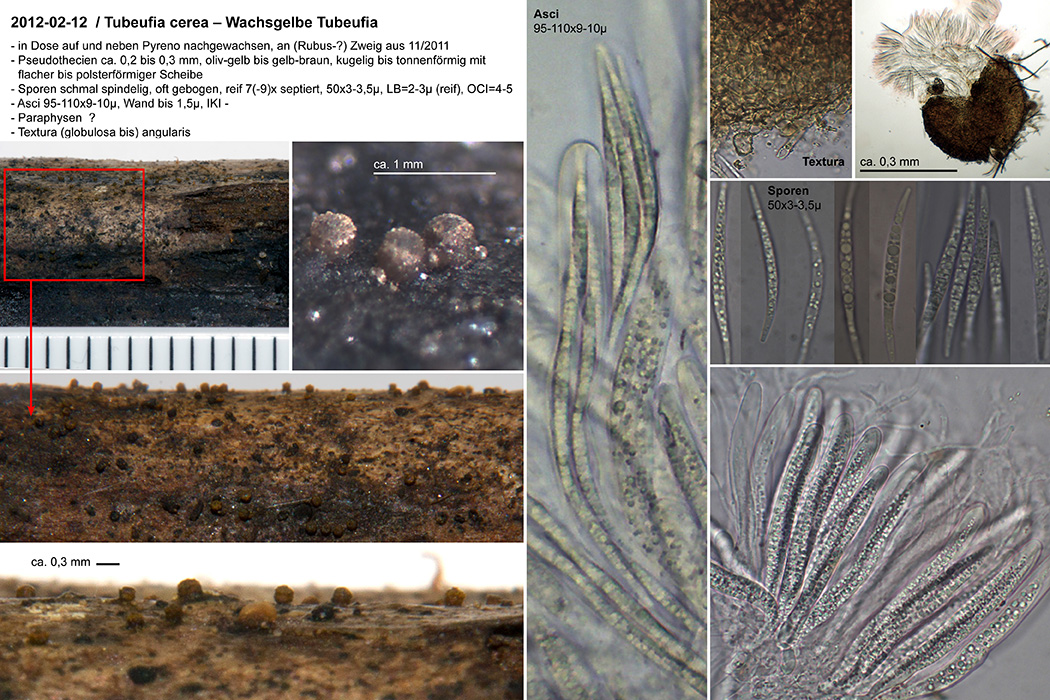 Hallo zusammen, anbei wieder ein Dosenfund an einem ziemlich morschen, außen von einem Pyreno geschwärzten Zweig (vermutlich eine Rubus-Art,