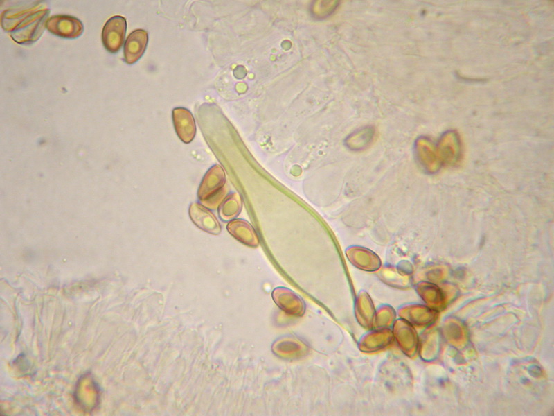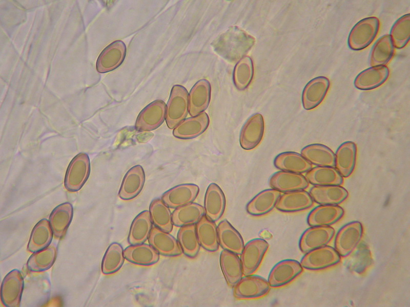 Funddaten: 10.08.2011; MTB 7934-3-4-1, 600 m; Leutstetten, Sonnenberg Süd, im Buchenwald, auf und um übermoosten Strunk, bei Buche und Esche; gesellig (>5 Fk); Sporen: subamygdaloid, nur ganz sporadisch mit lateraler Delle, Apex meist subkonisch bis schmal gerundet, 8,5 x 4,9 (7,5-9,5 x 4,5-5,5), Q=1,72 (1,50-1,90);