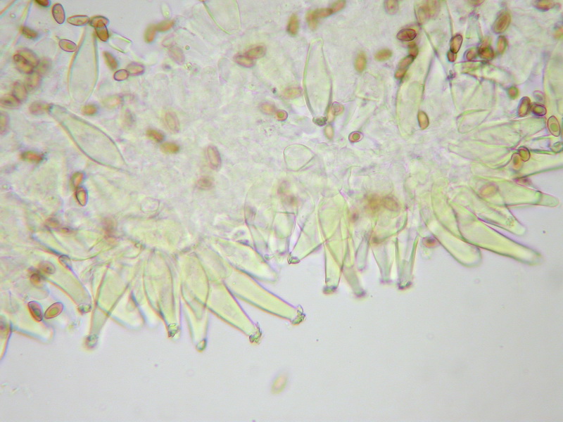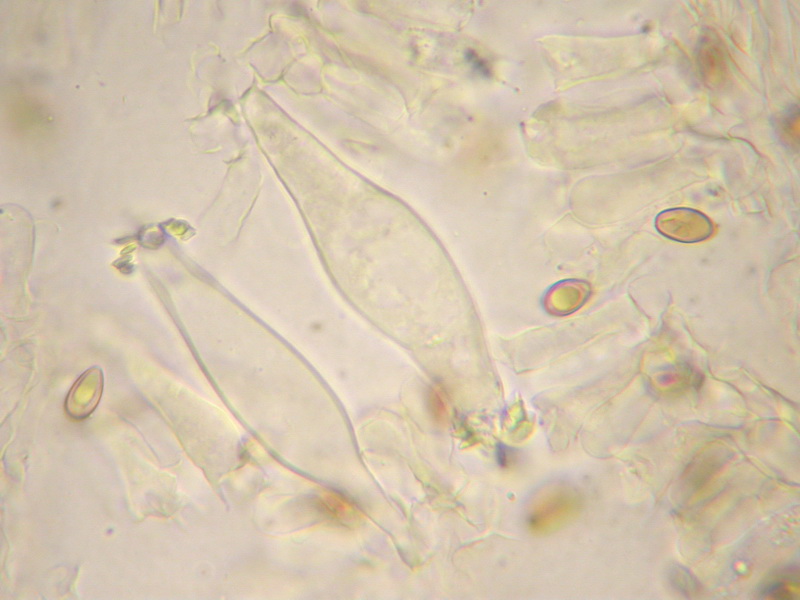 Pleurozystiden: lageniform bis sublageniform, mäßig bis normal beschopft, Wände in KOH deutlich gelb, ca. 60-78 x 13-19, Wandstärke am Bauch 1-1,5, am Hals 1,5-2;