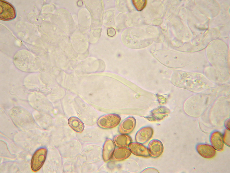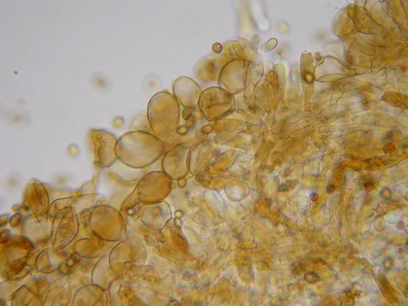 Cheilozystiden: teils intensiv goldbraun gefärbt, 48x14/1,5-2; 52x13/1,5; 65x20/3-3,5; durchsetzt mit keuligen, teils braun gefärbten und etwas dickwandigen Parazystiden: