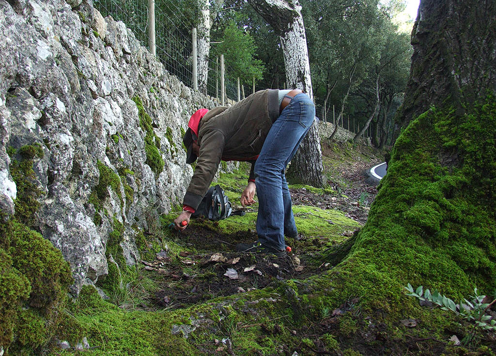 Ja, angekratzt ist das Image der Ferieninsel als Pilzparadies. Der Termin Felix‘ und meiner Reise stand fest, das Ziel mussten wir aufgrund der Gesamtwetterlage Anfang Dezember im Mittelmeerraum (tägliches Niederschlagsmengenupdate) noch präzisieren. Schlecht sah es aus, es wollte einfach nirgendwo ordentlich regnen. Zuletzt war auf Mallorca noch ein bisschen was runtergekommen. Gut wegen der kurzen Flugzeit. Nicht gut, da nur Kalk, und wenn der nun ausfällt ... Na ja, ich tröstete Felix damit, dass auch in dem Fall, dass wegen Regenmangels nichts steht, der Kalk sicher für eine reichliche Kratzausbeute sorgen würde, und das unwiderrufliche Kratzmandat mit der allumfassenden Lizenz zu kratzen hatten wir aus der über 1100-jährigen Domstadt an der Saale im Lande der Frühaufsteher auch erhalten. Doch weit gefehlt. In meiner Erinnerung hat Felix in den Steineichenwäldern wahre Kratzorgien veranstaltet, und wo wir langgekommen waren, sah der Waldboden aus, als wären je 99 Wildschweine durchgezogen. Doch außer zwei sterilen Krümeln nichts, nichts, nichts. Eine Anzeige bei den örtlichen Polizeibehörden hat Felix mit seinem sportlichen Einsatz am Fuß einer Solitärpappel an einem Feldrand auch noch riskiert. Da kam der Bauer mit seinem Wagen angebraust: Te pregunto che haces aquí..., sodass wir unverrichteter Dinge Leine ziehen mussten. Als letzter Hoffnungsanker waren die Silberpappeln an der Straße zum Kloster Lluc geblieben, an die ich mich (von Cortinarius paracephalixus u.ä. träumend) erinnerte. Da oben hatte es schon gefroren. Aber kratzen hält gut warm ...