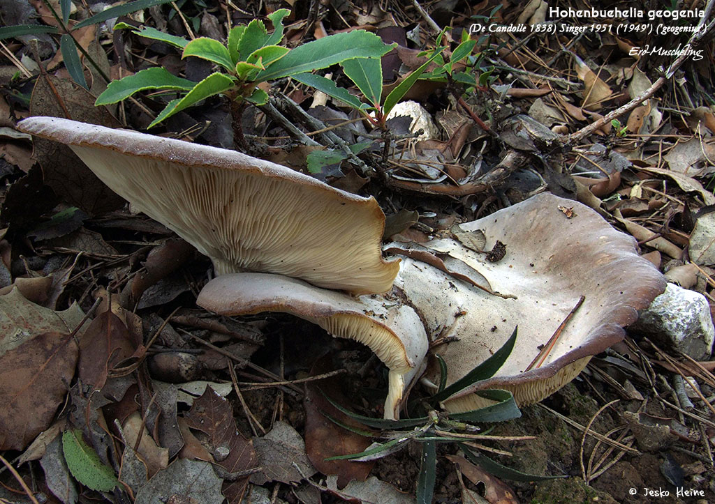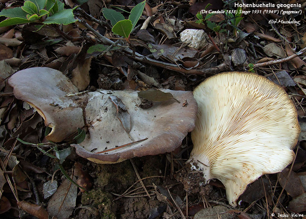 Wir haben den Fund aus einem Steineichenwald als Hohenbuehelia geogenia bestimmt und damit vorsichtshalber von der Synonymisierung mit H. petaloides abgesehen, denn wir haben große Fruchtkörper, die nicht direkt auf Holz wuchsen, beobachtet. Sie wiesen auch die für H. geogenia angegebenen größeren (länglicheren) Sporen auf, und die Lamellenschneide war mit Cheilozystiden übersät.
