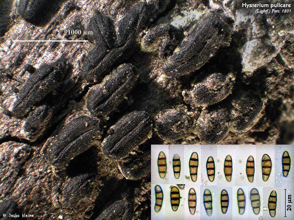 Der Spaltkohlenpilz (Hysterium pulicare) wuchs in großen Mengen auf dürren Erica-Zweiglein in einem küstennahen Kiefernwald auf Kalkfelsen.
