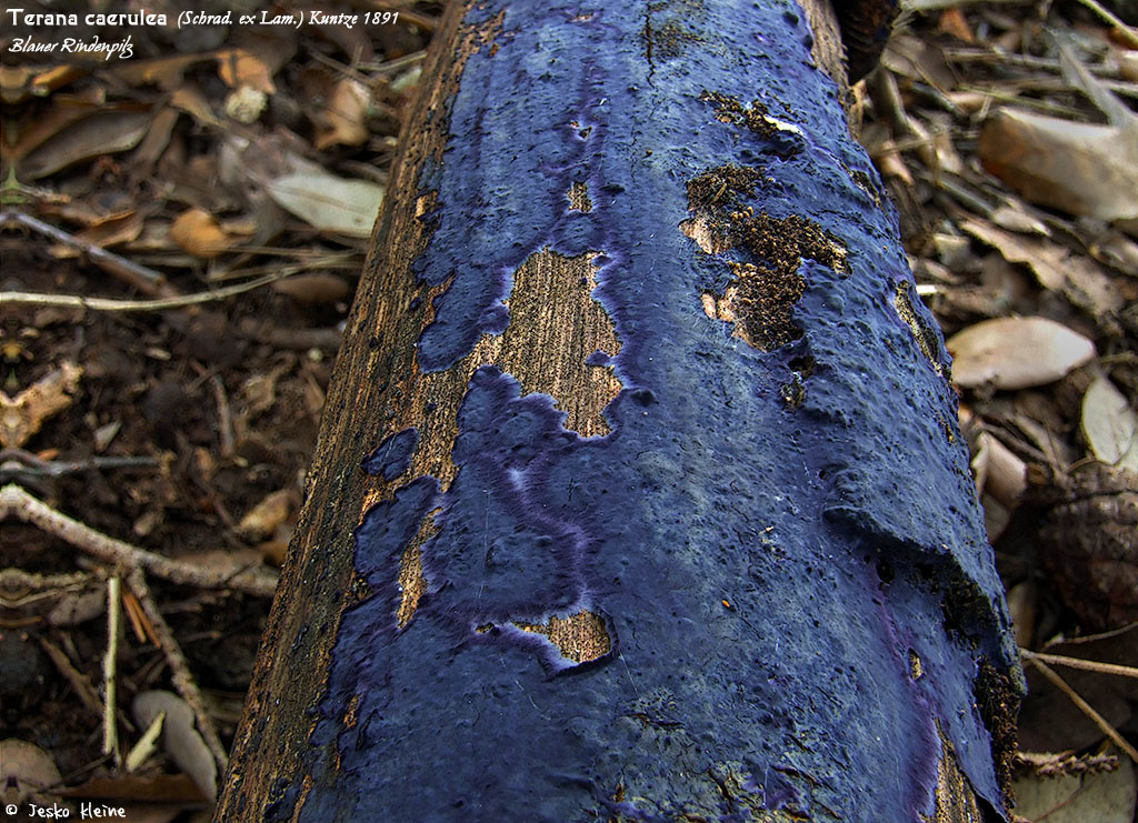 Der blaue Rindenpilz (Terana caerulea) überzog Äste und Stümpfe im schönen Steineichenwald Sa Comuna bei Bunyola, wo wir auch einen weiteren hübschen Farbtupfer hatten: