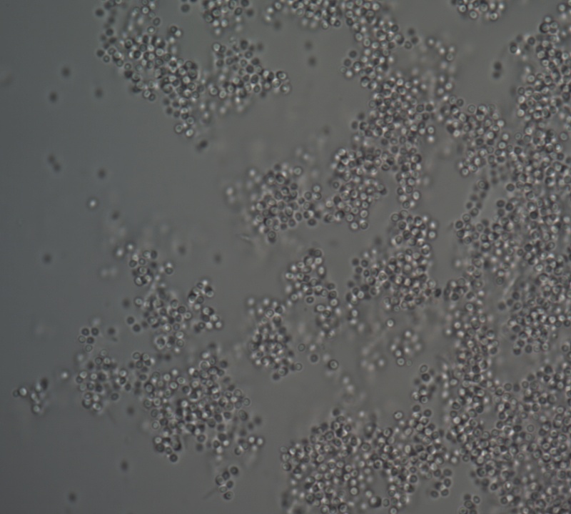 so sehen die Sporen der rosa Kügelchen übrigens aus. Der Durchmesser liegt etwa bei 1,4µ.