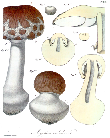 Hallo Ingo, solche Zusammenhänge fehlen doch häufig in diesen Datenbanken, das würde mich nicht allzu sehr stören. Die Sache ist die, dass sich Originalbeschreibung und -tafel von Vittadini (1833) von Agaricus rachodes auf einen Vertreter der Garten-Safranschirmlinge beziehen. Die Tafel hänge ich unten an. Diesen Namen kann man folglich nicht für den essbaren Safranschirmling verwenden. Chlorophyllum rachodes ist aber natürlich immer noch eine gute und auch bei uns vorkommende Art, daher wird in den Datenbanken der Zusammenhang mit Chl. olivieri wohl nicht extra vermerkt. Vellinga hat dem essbaren Safranschirmling (PdS 256) den Namen Chlorophyllum olivieri gegeben, weil sich Chl. rachodes wie gesagt auf eine andere Art bezieht (nämlich auf die, die von Mani auf den ersten drei Fotos gezeigt wird). Lepiota olivieri war der Name, der am besten für den essbaren Safranschirmling verwendet werden konnte. Schöne Grüße