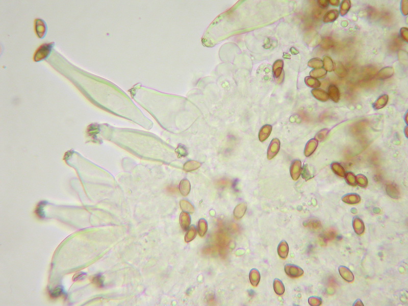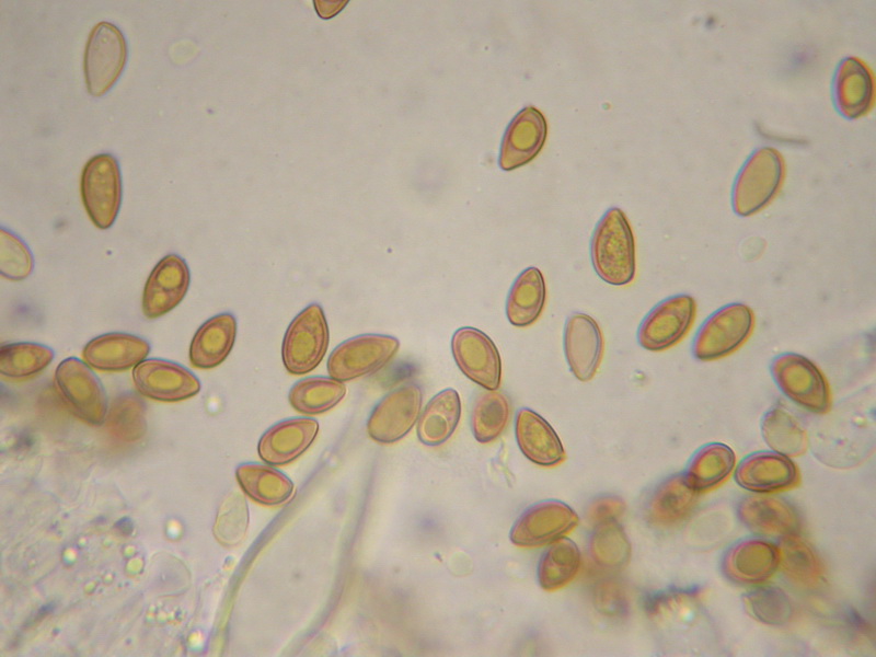 Sporen: amygdaloid, lateral ab und zu mit Delle, sehr dickwandig, Apex konisch und fast spitz, hin und wieder schwach papilliert, Kallus unauffällig, Maße: 9,4 x 5,5 (8-10,5 x 5-6), Q=1,70 (1,55-1,83):