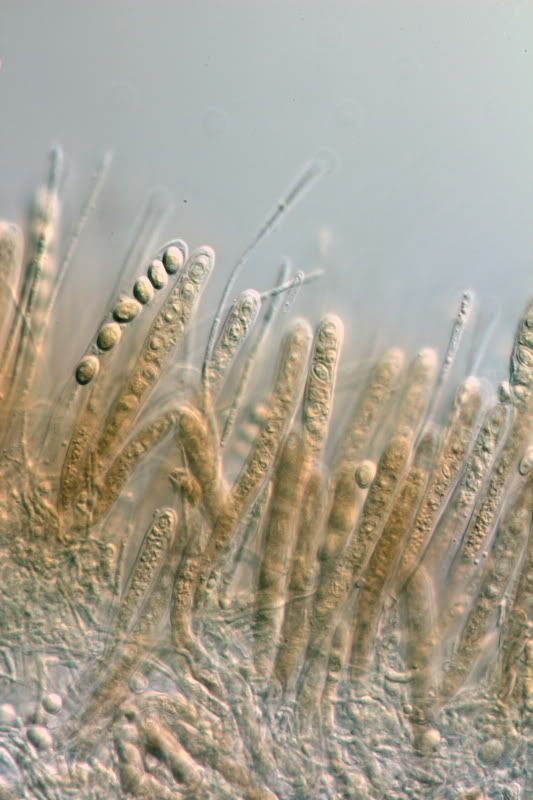 Wenn die Sporen dann ovoid sind, eine Größe von 7-10 x 5-6 µm aufweisen und viele kleine Tröpfchen beinhalten, landet man bei Lachnellula gallica. (Bei meinem Exemplar waren viele noch unreif.)