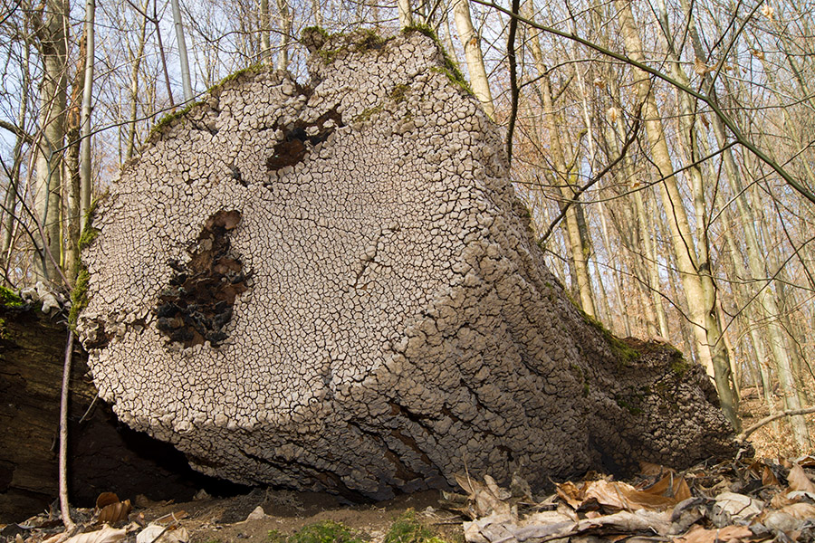 Schon vom Weg aus zu sehen sind die großflächigen Überzüge vom Mosaik-Schichtpilz auf den alten Eichenstämmen.