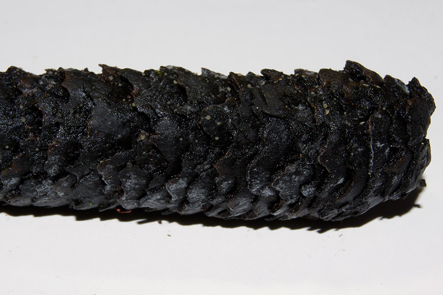 Etwas tiefer im Wald, an im Bach liegenden Fichtenzapfen, Apos (bislang) unter 1mm, die beinahe haarig wirkenden Randzellen