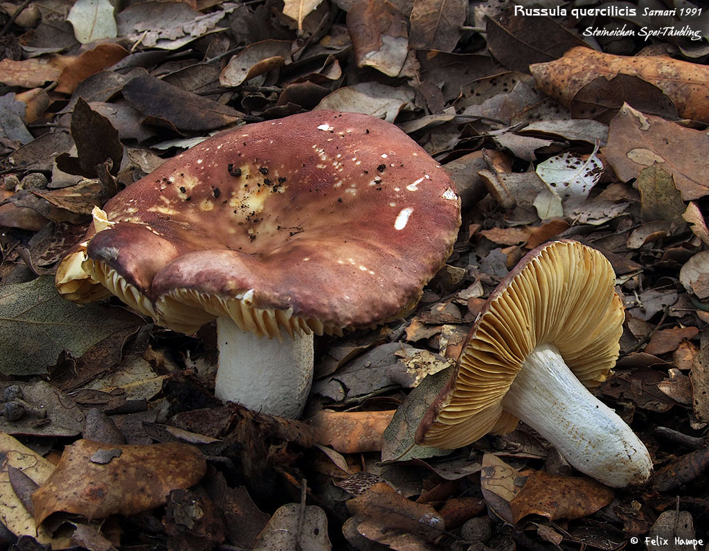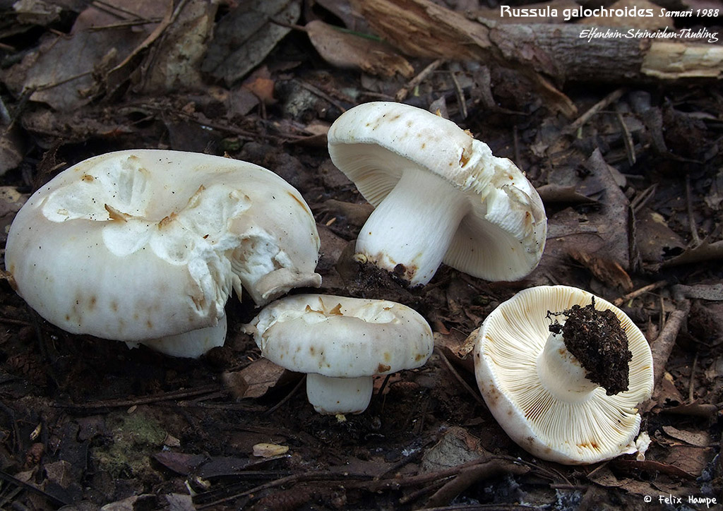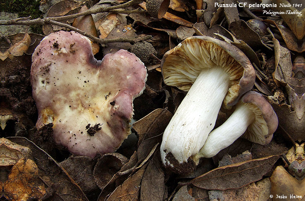 Bei dieser Russula pelargonia mussten wir aufgrund der hinlänglich bekannten Bestimmungsschwierigkeiten bei den Violaceinae (scheinbares Kontinuum an Formen, die violacea über pelargonia mit clariana verbinden) ein confer stehen lassen. Als gutes Merkmal, um diesen Formenkreis im Feld ansprechen zu können, sei hier an den Geruchsumschlag von Pelargoniengeruch zu kräftigem Fischgeruch erinnert, der m.W. zuerst von Einhellinger beschrieben wurde. Um es langsam aber sicher mit den Täublingen zu Ende zu bringen (so viele haben wir leider wirklich nicht gesehen), sollen hier noch zwei typisch mediterrane Arten vorgestellt werden, für die bislang keine mitteleuropäischen Nachweise bekannt sind (zumindest keine, die den Anspruch erheben dürfen, „sicher“ zu sein). Zu den typischen Griseinae, die die Steineiche auf Kalkböden begleiten, zählt der Elfenbein-Steineichentäubing (Russula galochroides).