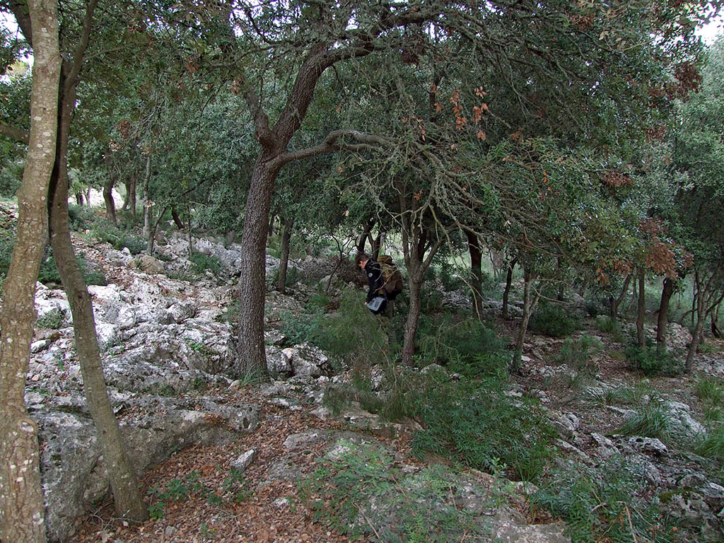 Viel Zeit lässt der Alltag nicht, um Vergangenes ab- und aufzuarbeiten. Daher ist auch schon wieder etwas Zeit vergangen, seitdem Felix und ich unter http://www.pilzepilze.de/cgi-bin/webbbs/pconfig.pl?noframes;read=219420 zur Exkursion in Mallorcas Kieferwälder eingeladen hatten. Damals haben wir eine Fortsetzung zugesagt, mit der wir mit Euch gemeinsam die Funde, die wir im Dezember 2011 aus mallorquinischen Steineichenwäldern mitgebracht hatten, Revue passieren lassen wollten. Nun endlich ist es so weit. Mehrere Male wurde ja schon erwähnt, dass der Steineichenwald (Quercetum ilicis) neben den mediterranen Kiefernwäldern das zweite große Waldhabitat auf den Balearen ist. Die Steineiche (Quercus ilex, Q. ilex ssp. ballota) und die Korkeiche (Quercus suber) sind im westlichen und zentralen Mittelmeerraum diejenigen immergrünen Vertreter der Buchengewächse (Fagaceae), die große geschlossene Wälder bilden, die in vielerlei Hinsicht mit unseren mitteleuropäischen Edellaubwäldern vergleichbar sind. Grob gesagt teilen sich dabei beide Eichenarten in die Aufgabe: Während die Korkeiche saure Böden bevorzugt, ist die Steineiche vorwiegend auf kalkhaltigem Untergrund zu finden und ist damit die typische Eiche auf den Balearen. Sie kann dabei reine Bestände mit mehr oder weniger ausgebildeter Strauchschicht bilden wie auch mit Kiefern, Erdbeerbäumen usw. durchmischt stehen. Typisch sind teils auch lockere Bestände, die einen Übergang zur mediterranen Strauchheide darstellen. Hier gehe ich in einem eher offenen Bestand mit recht mickrigen Steineichen schon einmal vor: