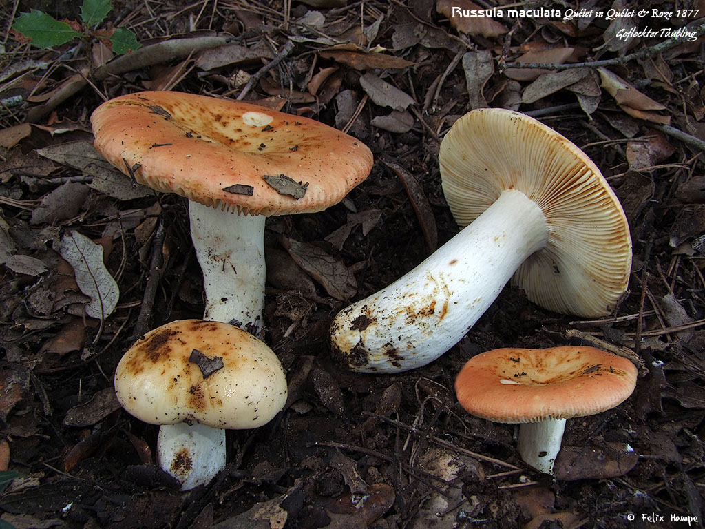 Der Gefleckte Täubling (Russula maculata) ist unter den scharfen Gelbsporern an seinem auffällig gelb bis gelbbräunlich verfärbendem Fleisch zu erkennen, daher der namensgebende gefleckte Hut. Mikroskopisch wird die im Feld getroffene Vermutung durch die Beobachtung der nicht inkrustierten, unseptierten oder kaum septierten Dermatozystiden in der Huthaut und der mittelgroßen Sporen, deren Ornament mit kräftigen mehr oder minder gratig verbunden Warzen teilweise netzig ist, abgesichert. Im Mittelmeerraum ist Russula maculata nach Sarnari eine typische Begleitart der Steineiche (nicht der saure Böden bevorzugenden Korkeiche) und ist hier vor allem in den mit Steineiche durchmischten Strauchheiden häufig. Ebenfalls aus der Gruppe der scharfen Gelbsporer ist uns mit dem Steineichen-Dottertäubling (Russula juniperina) eine aufgrund ihres stark glänzenden, intensiv rot gefärbten Hutes sehr auffällige Art ins Netz gegangen.