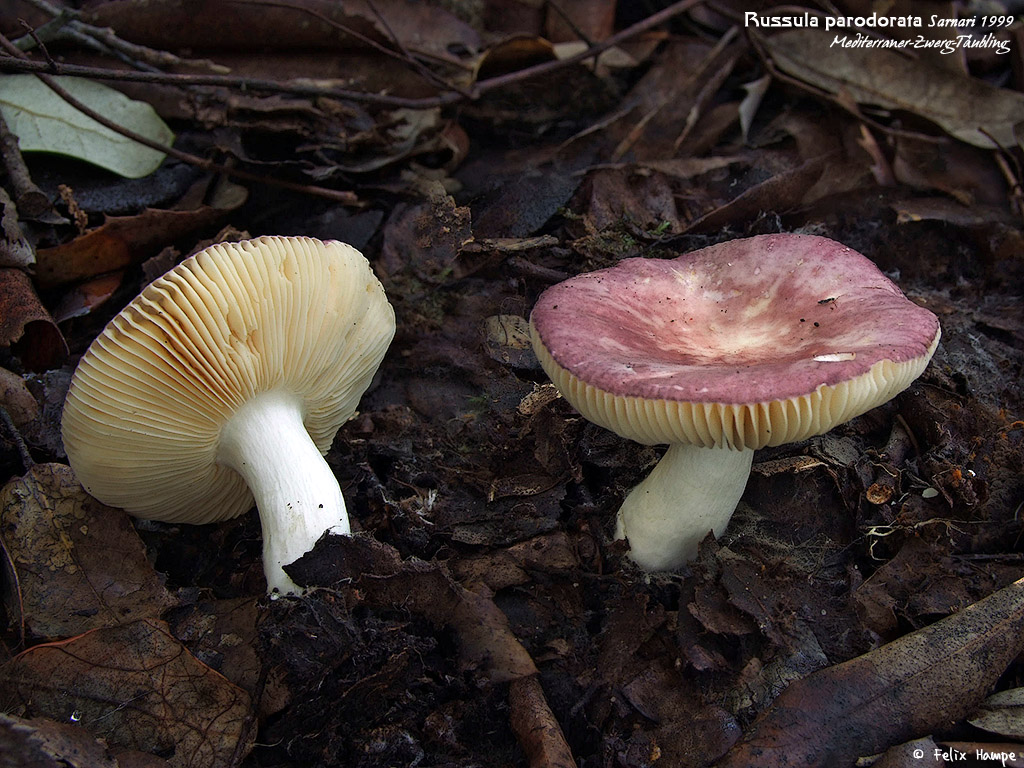 Der Mediterrane Zwergtäubling (Russula parodorata) gilt als der häufigste Vertreter der Gruppe um Russula odorata in Steineichenwäldern. Der für einen „Zwergtäubling“ verhältnismäßig großen Art (man ist versucht, sie bei den kompakten Polychromae und nicht bei den „zartfleischigen“ Tenellae zu suchen) fehlt der bei Russula odorata vorhandene Pelargoniengeruch, und die Huthaut ist nicht wie bei den meisten anderen nahestehenden Arten glänzend. Die kaum septierten Dermatozystiden sind ebenfalls ein wichtiges Bestimmungsmerkmal. Eine weitere typische Russulaceaee des Steineichenwalds, die auch in der Spätsaison noch reichlich zu finden ist, ist der Atlantische Milchling (Lactarius atlanticus).
