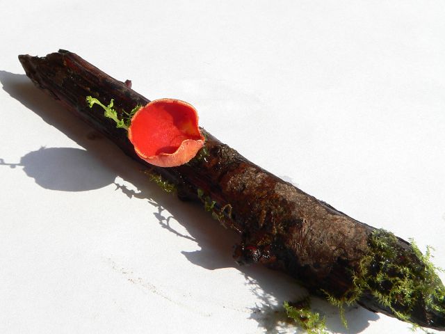 Vor einer Woche war ich bei einer Geburtstagsfeier am Schwarzwaldrand im Markgräflerland. Dabei konnte ich mir einen Rundgang natürlich nicht verkneifen. Ohne große Erwartungen angesichts der Trockenheit hoffte ich doch auf Anemonenbecherlinge an einem moosigen, schattigen Bachrand. Davon habe ich jedoch keine gefunden, dafür meine ersten Kelchbecherlinge. Am Standort konnte ich nur ein lausiges Handy-Foto machen. Die Lumix lag ja im Auto. Und ich bin auch gar nicht auf die Idee gekommen, nach Begleitbäumen Ausschau zu halten. Die meisten Fruchkörper waren tief im Grün versteckt. Einen Zweig habe ich mitgenommen.