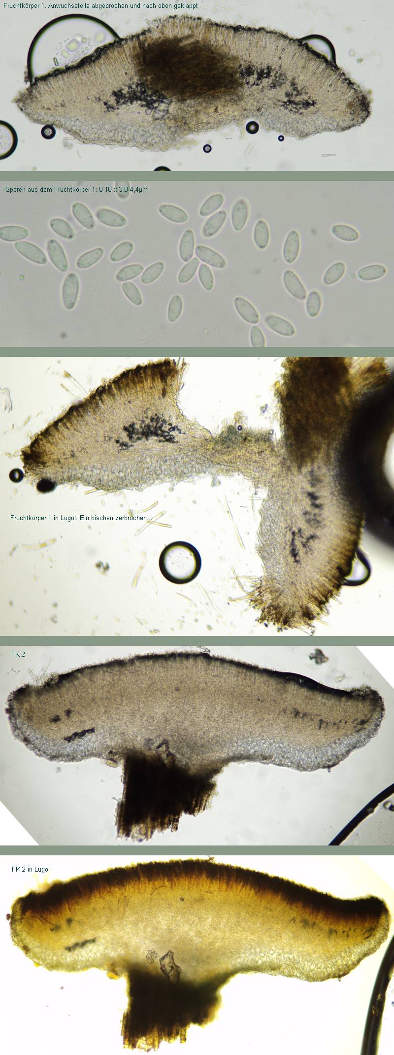 Ob man in den Lugolbildern eine Blauverfärbung an der Basis erkennen kann... ich bin mir unsicher. Was man in den Wasserbildern schön sieht, ist die Farbe der Fruchtschicht. Das Excipulum ist völlig farblos, die Masse dazwischen gelblich.