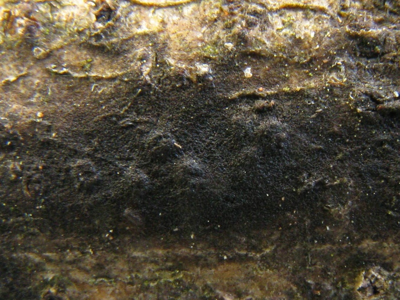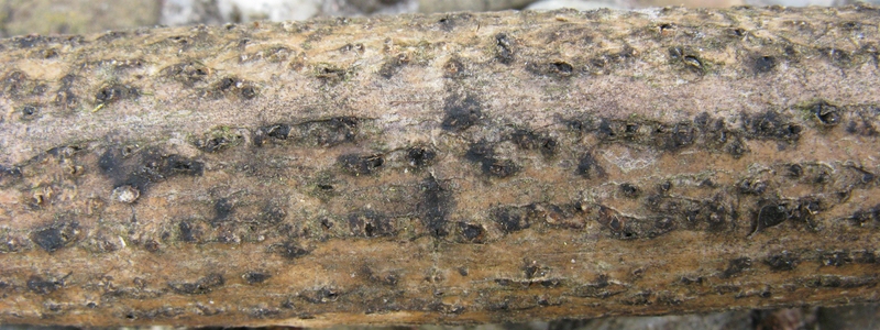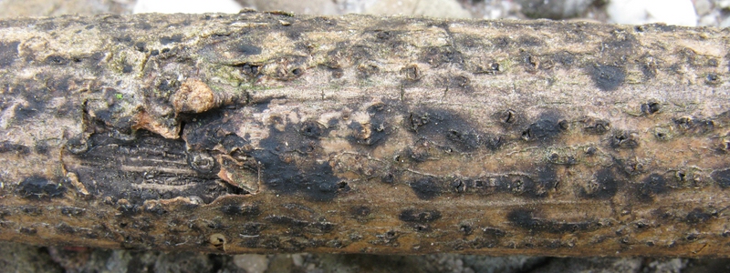 Das Camarosporium-Stadium wächst offenschtlich als dünner, körniger Belag um und auf den Ruinen des vorjährigen Ascus-Stadiums.