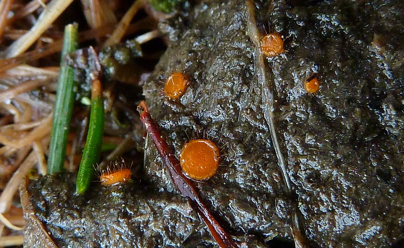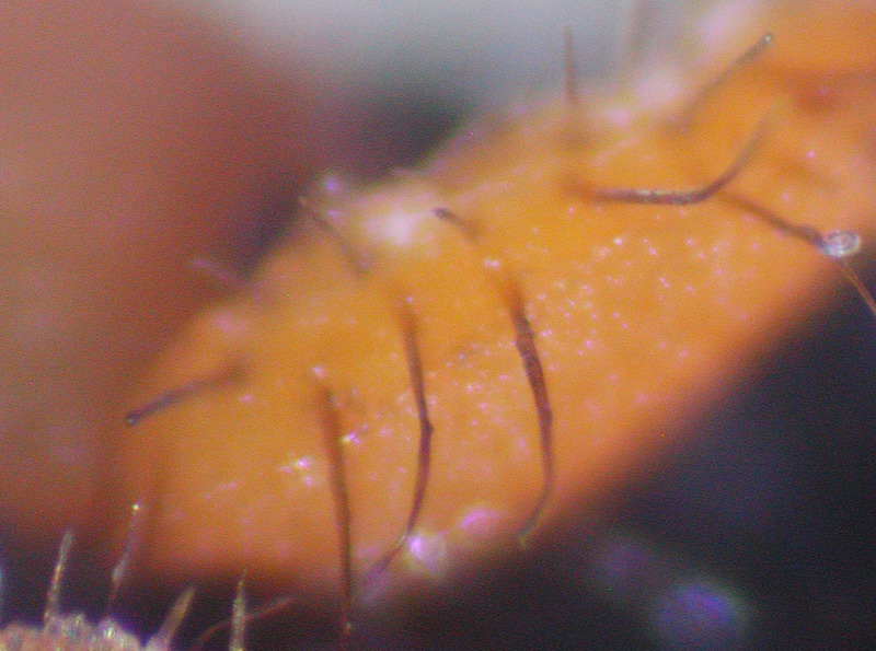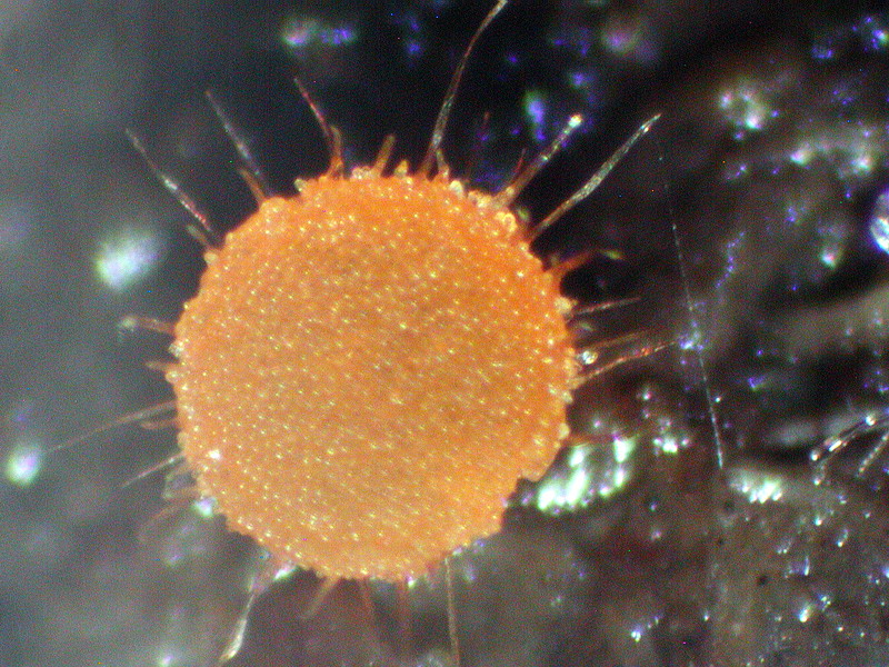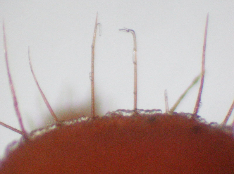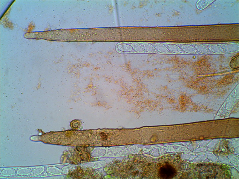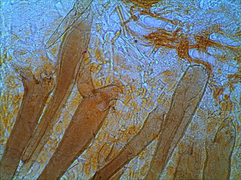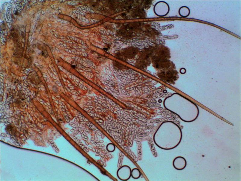 Liebe Pilzfreunde Diesen Borstling hatte ich nun schon zweimal unter dem Glas, und ich bin so schlau wie vorher. Auffälligkeiten sind m.E. die sehr langen Haare sowie die ornamierten Sporen. Sternförmige Haare an der Unterseite konnte ich nicht finden.
