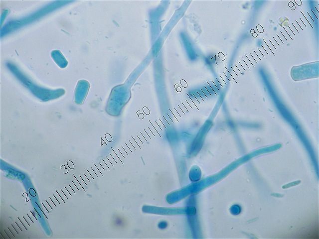 Spatelförmige Zellen mit parallel-ovalen Konidien (x400)