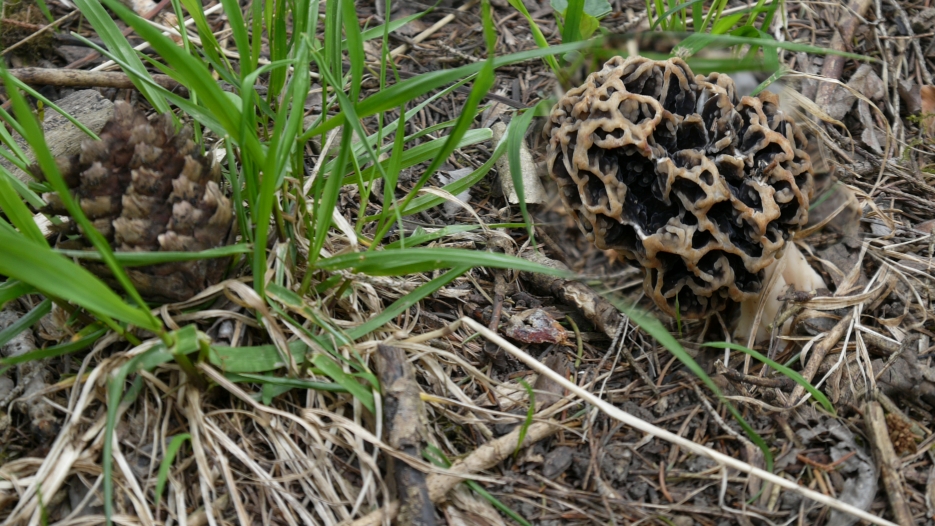 Die Farbgebung der Morcheln ist voll auf einen alten Fichtenzapfen zugeschnitten!