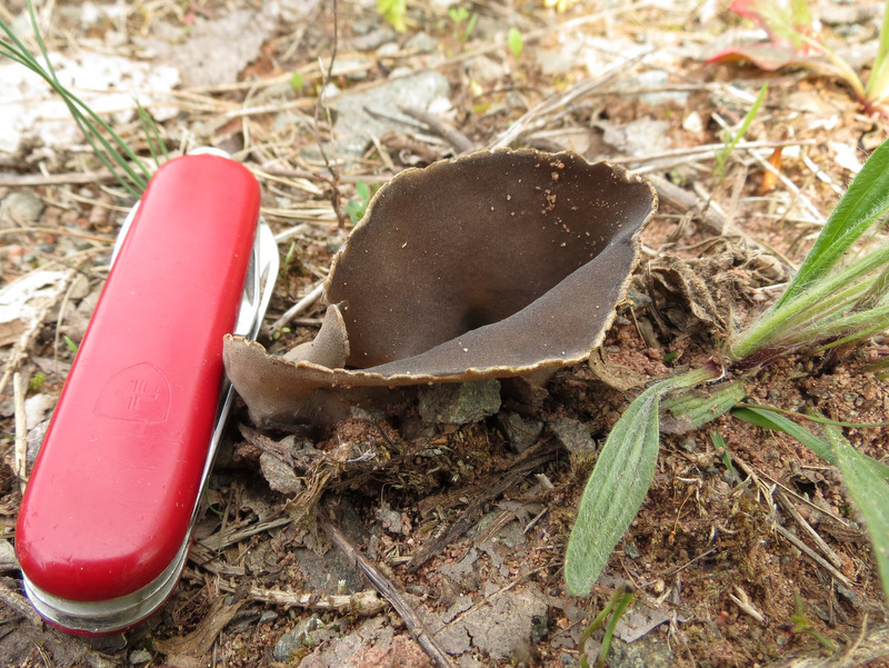 Von einer Ruderalfläche nahe dieses Waldes noch eine Schwarzweiße Lorchel (Helvella leucomelaena)