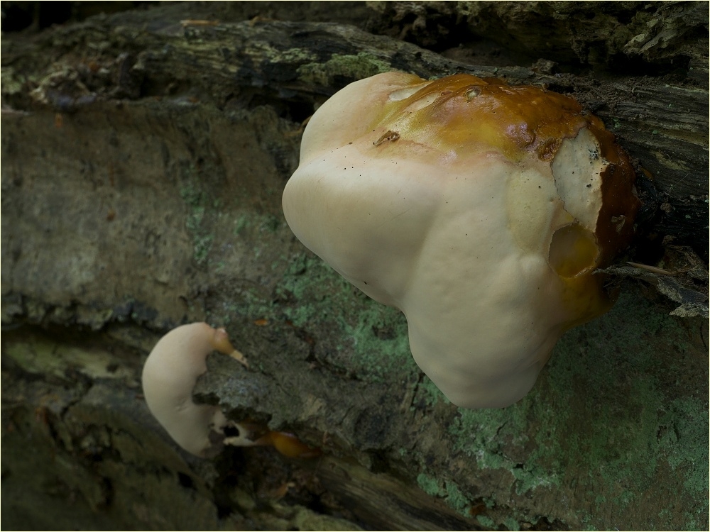 an altbekannter, liegender Hainbuche, im wohlbekannten, nordhessischen Pilzparadies quellen sechs kleine Kupferrote Lackporlinge aus dem Moderholz.