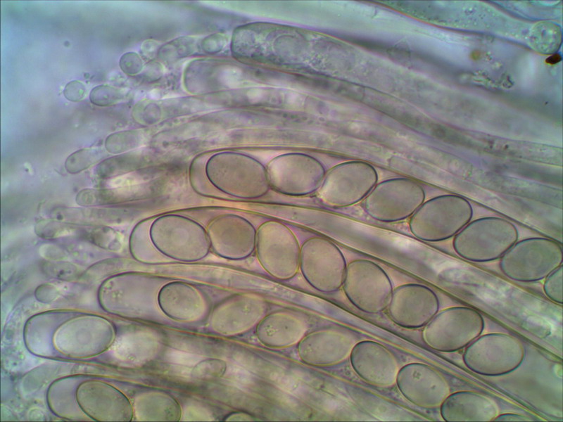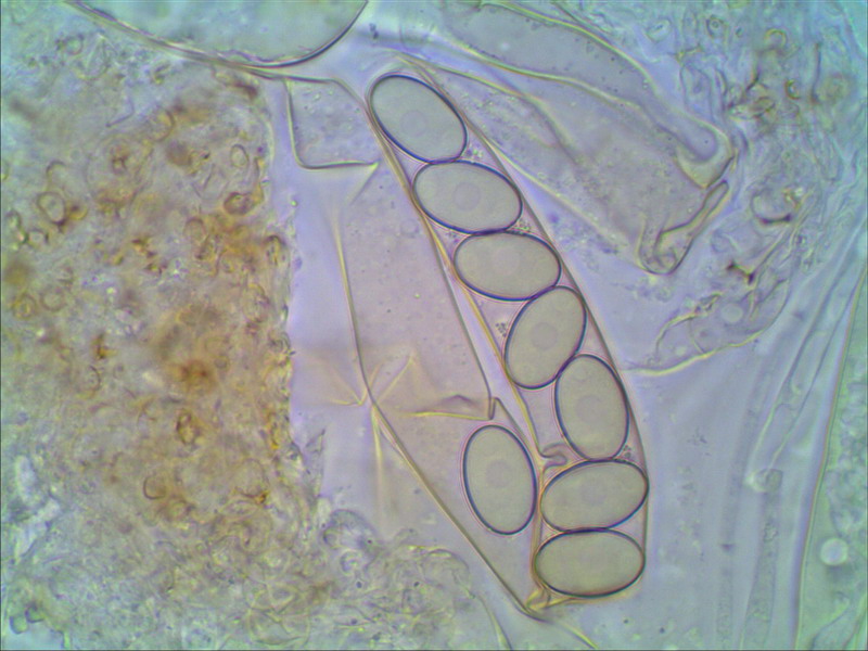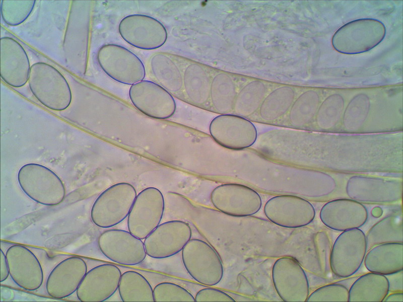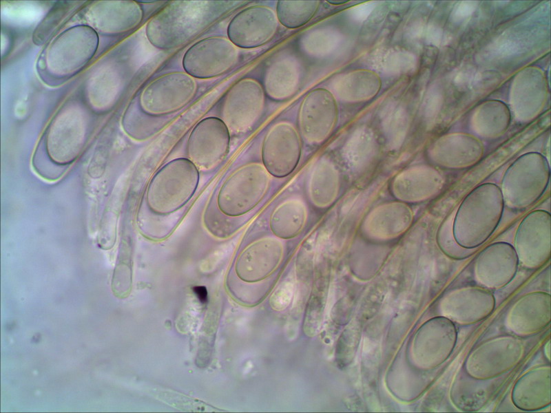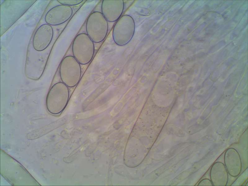 Liebe Pilzfreunde Mit diesen Becherling habe ich mich etwas beschäftigt und komme zu keinen Ergebnis. Ein glattsporiger Becherling mit farblosen Paraphysen, die an der Spitze nur leicht verdickt und gebogen sind. Weiterhin beschäftigt mich die Frage, ob Öltropfen vorhanden sind. Ich sehe ziemlich undeutlich drei Kreise in den Sporen, aber ob es Öltropfen sind?! Hier einige Bilder, die Pilze sind noch vorhanden. Wer kann Hinweise geben?