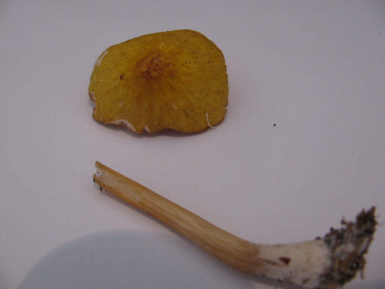 Der Hut ist leuchtend gelb ( in der Mitte rötlich ) , die Lamellen sind leicht rötlich .