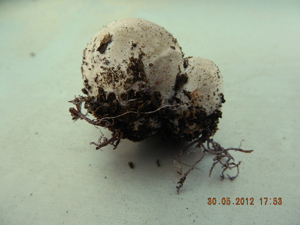 Heute mittag fielen mir am Gaffenberg in Heilbronn einige seltsame Hexeneier auf, die in der Größe zwischen Stinkmorchel und Tintenfischpilz lagen. Das Exoperidium dieser Hexeneier ist relativ dickhäutig und zäh, ca. 1 mm dick. Die Außenseite ist weißseidig-feinfilzig, am Scheitel neutral grau, auf jeden Fall nicht so lilagrau wie die Hexeneier des Tintenfischpilzes und auch nicht so feinwarzig-körnelig wie diejenigen der Stinkmorchel. Die basalen Myzelstränge haben einen deutlich hellvioletten Farbstich (das kommt auf dem Bild leider nicht rüber). Ein Schnittbild (1x längs, 1x quer) folgt im Anhang. Da am Fundort leider noch keines der Hexeneier aufgebrochen war, habe ich mal vier Exemplare mitgenommen. Zwei Hexeneier schlummern jetzt in einem Marmeladeglas, vielleicht gehen sie auf.