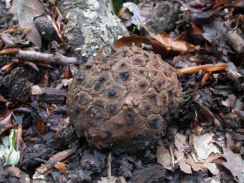 Hallo Pilzler, nach etwas längerer Zeit hatte ich heute endlich mal wieder Gelegenheit, in den Wald zu gehen. Trotz der Regenfälle der letzten Zeit ist in meiner unmittelbaren Umgebung (Nordeifel südlich von Aachen) immer noch recht wenig los, zumindest was "normale" Pilze (mit Hut und Stiel) angeht ... schön war es trotzdem. Immerhin habe ich eine neue Stelle mit Sumpfhaubenpilzen entdeckt, aber der interessanteste Fund des Tages war für mich ein trüffelartiges Objekt, das am Fuss einer Eiche wuchs, direkt an einer Wurzel. Das Bild unten zeigt es genau so, wie es gefunden habe, im Originalzustand. Der "Fruchtkörper" (sofern es denn wirklich einer ist ...?) hatte eine Größe von ca. 3 x 5 cm und war sehr hart. Ein Querschnittsbild füge ich gleich noch bei, auffällig sind dort die kugelartigen weißen "Einschlüsse". Ein auffälliger Geruch war nicht festzustellen. Der Boden in dem Gebiet, in dem ich den Fund gemacht habe, ist normalerweise eher sauer. Ich habe keine Ahnung, um was es sich hier handeln kann, zudem habe ich auch keine vernünftige Literatur zu trüffelartigen Pilzen. Nicht unwahrscheinlich ist auch, dass der "Pilz" noch unreif ist ... Habt Ihr einen Tipp? Morgen abend hätte ich Gelegenheit, mal durchs Mikroskop zu schauen. Worauf sollte ich da besonders achten? Viele Grüße,