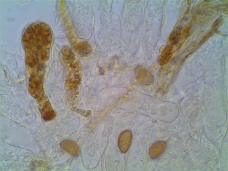Moin Helmut Nun Frage 3 löse ich auf mit auffälligen mikroskopischen Merkmal. Cheilozystiden mit bräunlichen Inhalt, Sporen sehr groß, im Mittel 13,5µm x 7,3µm. Nun fehlt noch der Geruch, und dann ist es gelöst. Du bist ja schon sehr nahe drann. LG Hartmut