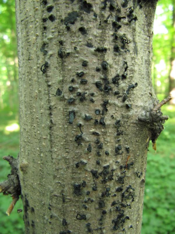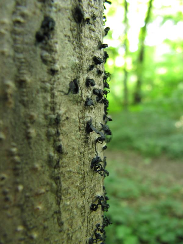 Hallo, diesen Ascomyceten (Pyrenomycet?) habe ich auf der Rinde eines noch stehenden, toten Baumes gefunden. Ich habe leider vergessen, zu schauen, was da so drumherum steht, um das Substrat evtl eingrenzen zu können. Jetzt im Nachhinein würde ich vermuten, dass es Holunder sein könnte, obwohl der Stamm recht gerade war. Der Pilz hat mich an Glyphium elatum erinnert, den ich schon mal auf Bildern gesehen habe. Der passt aber nicht.