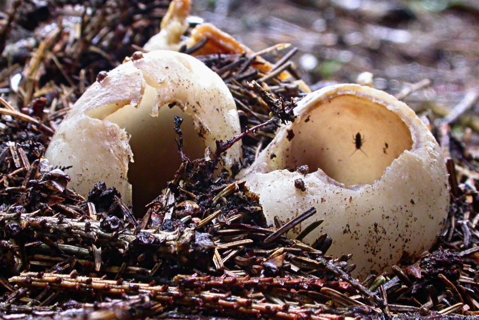 Drei schon etwas ältliche Kronenbecherlinge (Zeit ist bei Becherlingen relativ) lächeln aus der Fichtenstreu.