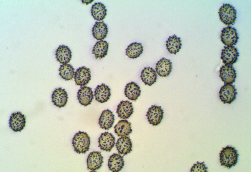 Mit KOH 20% tritt eine satte orangerote Färbung auf der Stielbasis ein. Die Sporen sind nicht so netzig bei dieser Kollektion zu finden, wie z.B. im SARNARI dargestellt. Jedoch dürfte es sich mit dieser Verfärbung an der Stielbasis und absolut milden Fleisch um keinen anderen Täubling handeln, oder?