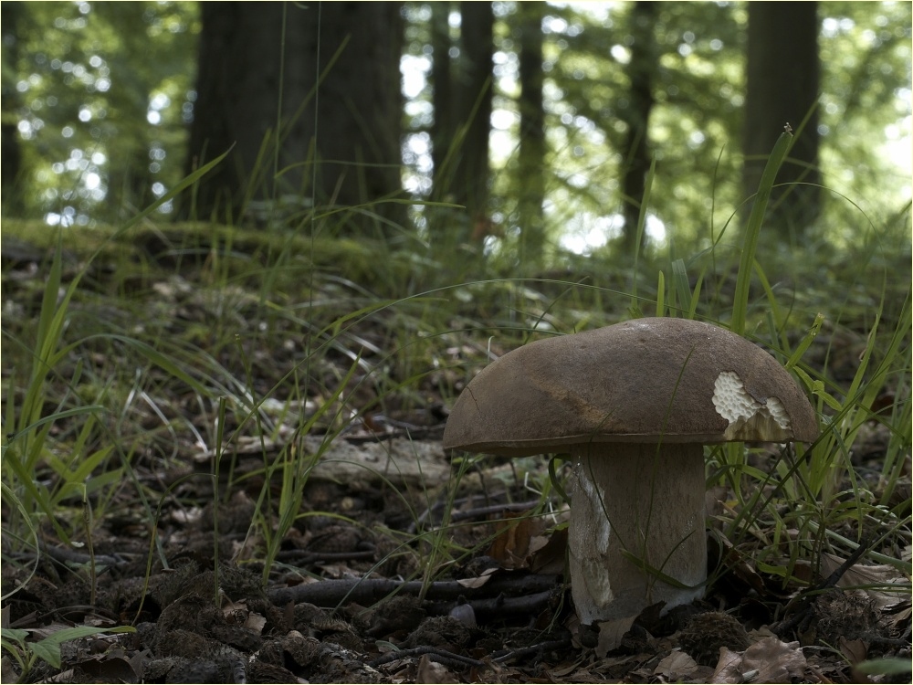 Zwischen alten Buchen und Eichen, auf magerem, kalkigen Grund fanden sich heute in ca. einem Meter Abstand dieser und ein weiterer, kleinerer Bolet. Die Poren des kleineren, dunkleren Exemplars sind fast weiss wie das Fleisch. Beim grossen Pilz zeigt das Fleisch minimale, schwach rötliche Verfärbungen im Anschnitt. Der Geschmack ist mild und die Konsistens fest. Die Huthaut fühlt sich an wie Wildleder. Der Stiel trägt ein sehr feines Netz.