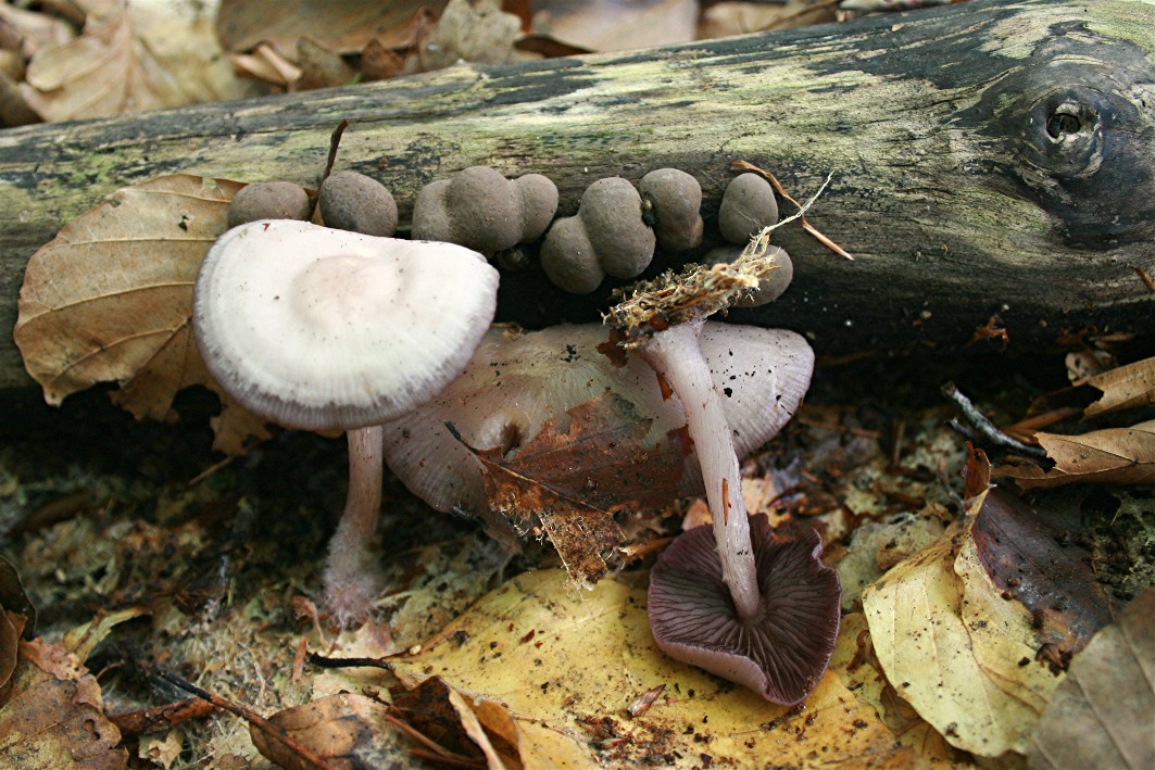 Hallo Pilzfreunde, noch mal zwei Fragen: (1) Liege ich bei dem Schwarzgezähnelten Helmling (Mycena pelianthina) wg. den dunklen Lamellenschneiden richtig? (2) Was sind das für dunkelbraune, bereifte, holzige Beeren im Hintergrund? Das Substrat ist Laubholz, es kann Buche/Hainbuche, Hasel, vielleicht auch Ahorn, eine Weidenart oder Erle sein - alles waechst in der Nähe. Fuer Hypoxylon fragiforme sind sie mir eigentlich zu glatt und ebenmaessig. Vielleicht eine alte Hypoxylon fuscum? Dafuer waere sie aber wiederum zu gross - so ein einzelner "Bobbel" misst gut 1 cm. Damit waere das Ding für den Kohlen-Kugelpilz (Daldinia concentrica) wiederum zu klein... Wer weiss Rat? Gruesse - Rika