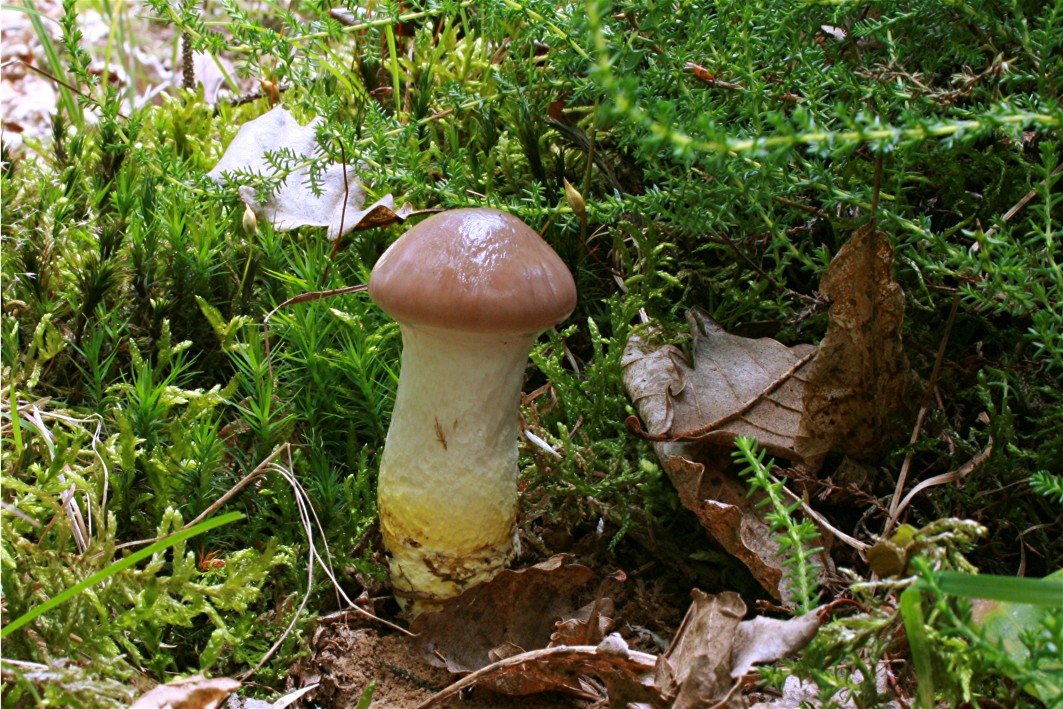 Hallo! Heute = gestern fand ich endlich mal wieder einen Gomphidius. Die 3 Exemplare sind leider noch recht jung mit geschlossenen Hüten - naja, besser als zu alt ;-) Der Hut-Ø vom Foto beträgt ca. 3,5 cm und hat eine deutliche Schleimschicht, obwohl es gerade sehr trocken ist. Einen noch kleineren habe ich längs geteilt: voll, unteres Drittel chromgelb, Rest schneeweiss. Die Farbe des Hutes entspricht - zumindest auf meinem Bildschirm - sehr gut der Realität. Geruch und Geschmack unauffällig. Standort: Kleinräumiger HotSpot auf Sand mit durunterliegenden Lehmschichten - hier muss es unterirdisch deutlich nass sein. Alter Fichtenbestand grenzt an frühere Windbrache, in der Eichen gepflanzt wurden und sich selbst überlassen mit allem Möglichen zugewachsen ist. Der fotografierte FK stand auf einem Mooshubbel mit Heidekraut, die beiden Kleinen auf einem anderen Hubbel, der nur bemoost war. Wenn ich die drei G.-Arten (glutinosus, macalatus, roseus) mit weissem Trama anschaue, die ich in meiner bescheidenen Literatur finde, so passt keiner davon. Habt Ihr mir einen Tipp? Grüße - Rika P.S.: